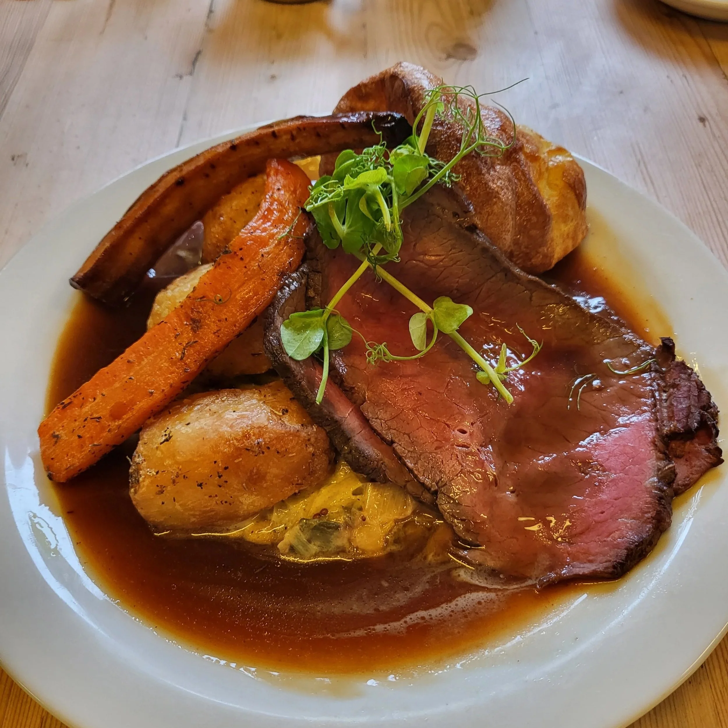 Join us for a hearty home cooked Sunday Roast Lunch. With Beef from our Butchery, crispy garlic and herb roast potatoes, carrots, honey roast parsnips and seasonal vegetables, Yorkshire pudding and lashings of red wine gravy!